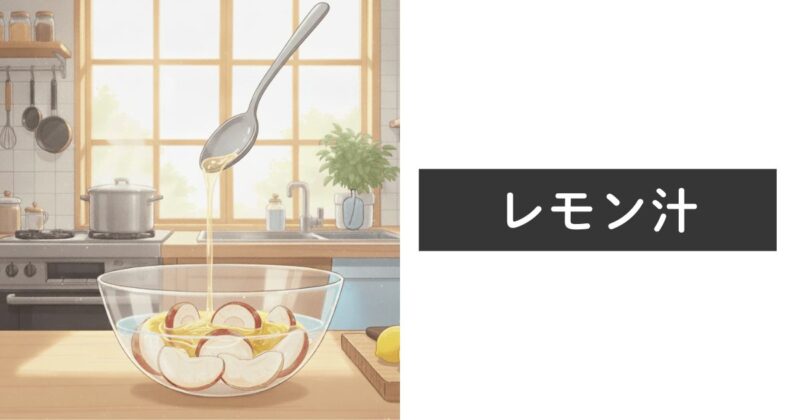 水200mlにレモン汁小さじ1〜2を混ぜたレモン水に2〜3分浸けるか、レモン汁を直接切り口に塗ります。