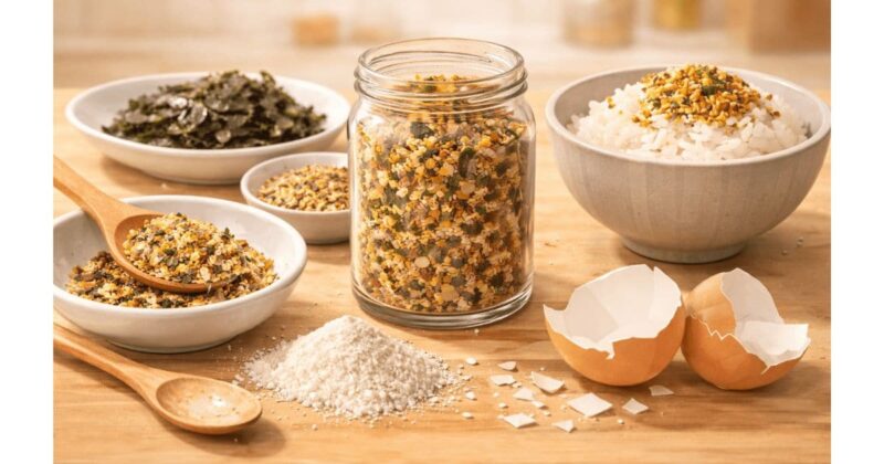卵殻パウダーに、煎りごま、青のり、かつお節、少量の塩を混ぜて「カルシウムふりかけ」を作ります。このふりかけをご飯にかけるだけで、不足しがちなミネラルを補えます。