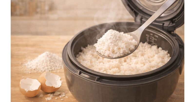 お米を炊く際に、卵殻パウダーを少量加えます。炊き上がったご飯は見た目も味もいつも通りですが、一膳あたりのカルシウム含有量は大幅にアップします。