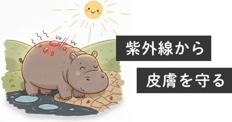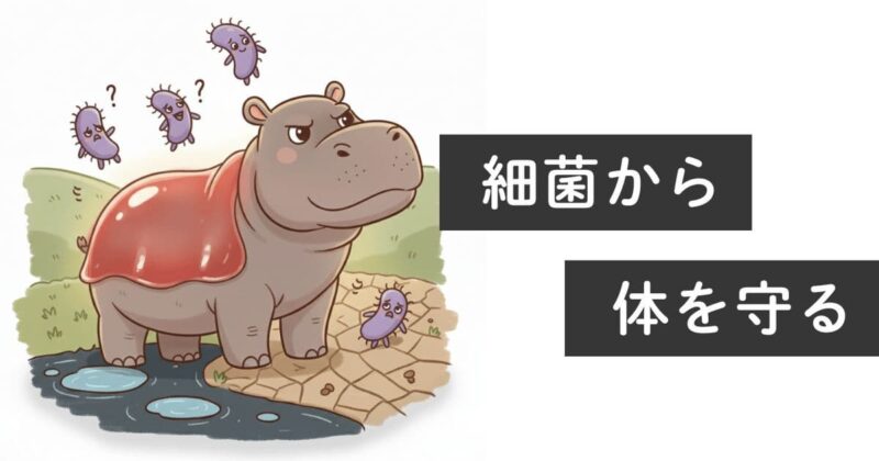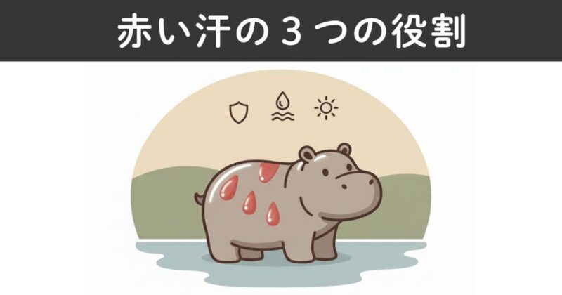 カバの「赤い汗」は汗や血ではなく、皮膚を守る分泌液です。分泌液には、保湿・UVカット・殺菌抗菌という3つの役割が隠れています。