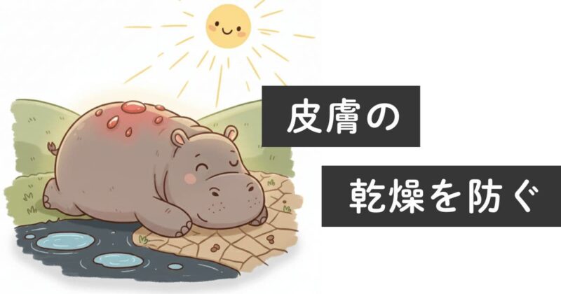 カバは水辺で過ごす時間が長い動物ですが、実は皮膚がとても乾燥しやすい性質なのです。日中に陸に上がると、体表からの水分蒸発が急速に進んでしまい、皮膚がひび割れてしまうこともあります。