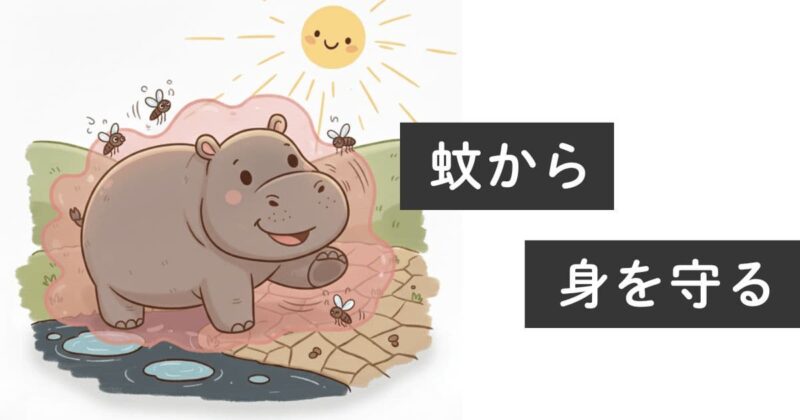 カバの赤い汗のような分泌液には、蚊の着地・付着を抑制する性質の成分が含まれています。蚊の接近を減らすことで蚊の寄生を防ぎ、病気のリスクを下げる効果があります。