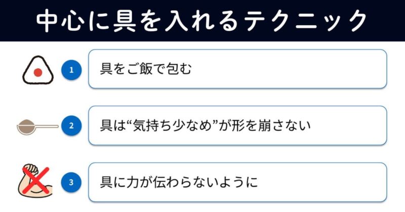 具が偏ったり、外に飛び出したりするのは、おにぎり作りのあるあるです。しかし、三角おにぎりは中心に空間をつくりやすい形なので、ちょっとした技で具を中心に入れることができます。